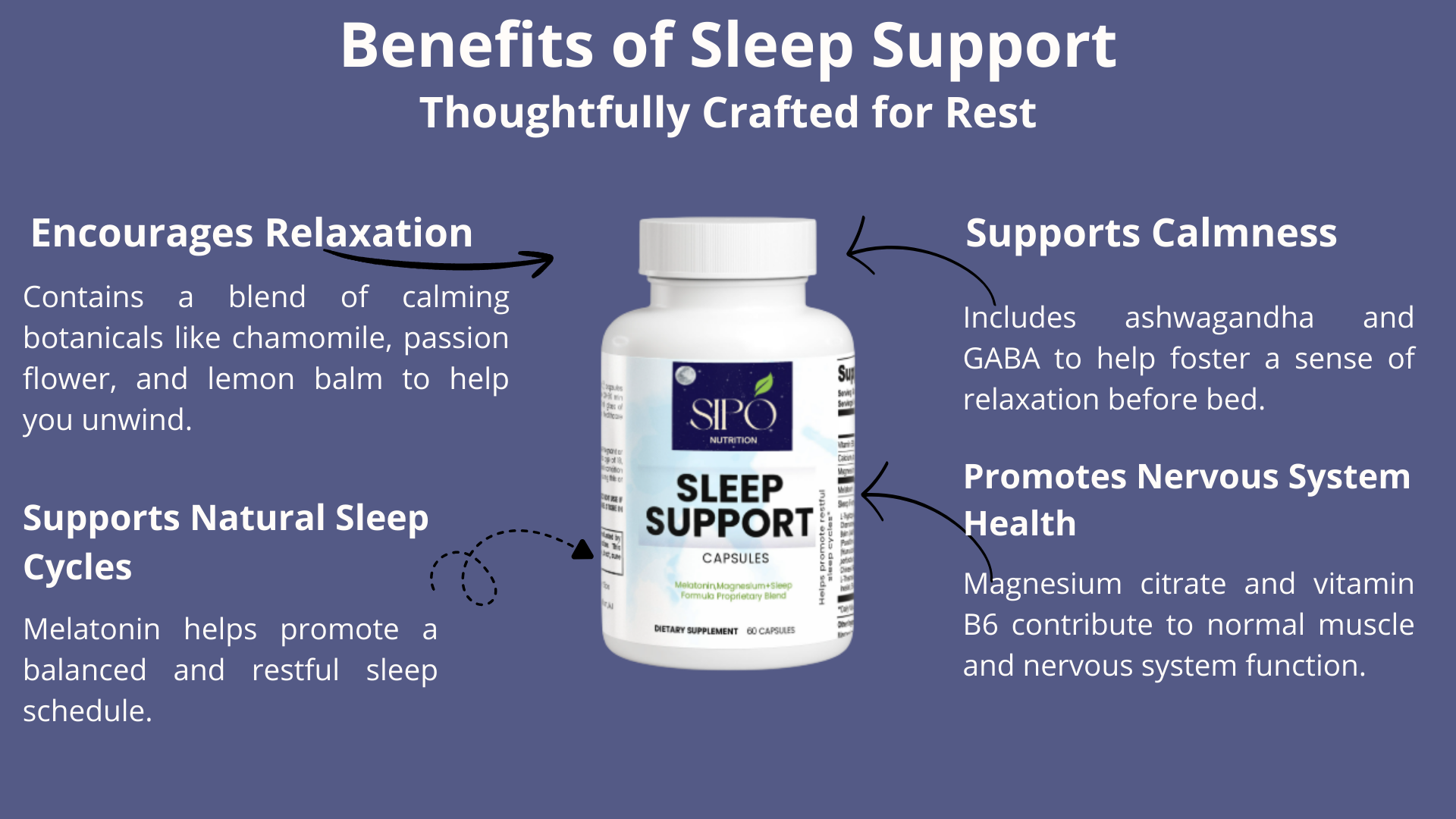 Our Sleep Support Capsules feature a thoughtfully balanced blend of vitamins, minerals, amino acids, and botanicals traditionally used to support relaxation and nighttime balance.